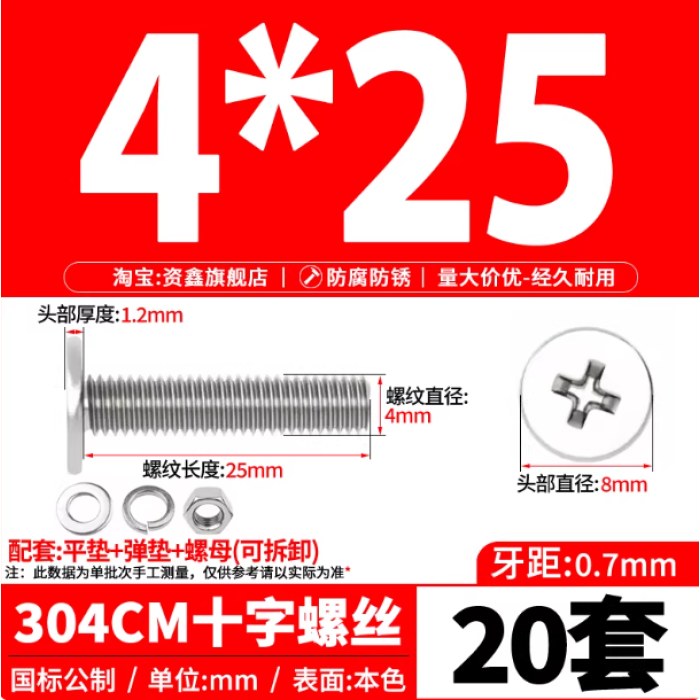 304不锈钢扁平头十字螺丝钉 M4*25 (头径8) 20套/组 单位 组
